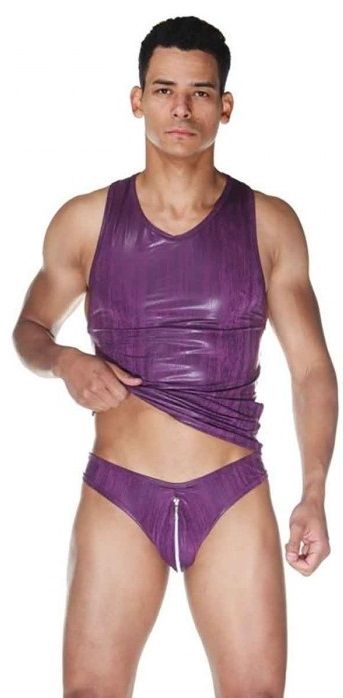 Комплект для мужчин, состоящий из майки и трусов-слипов. На трусах серебристая молния, весь комплект из мягкой, гладкой, блестящей ткани. В комплекте: майка, трусы.