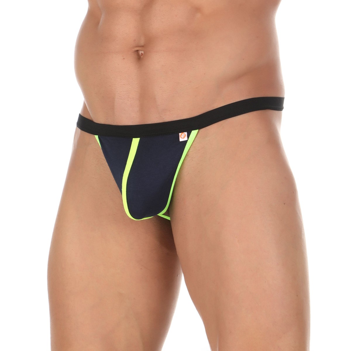 Темно-синие сексуальные трусы-стринги с салатовой окантовкой.