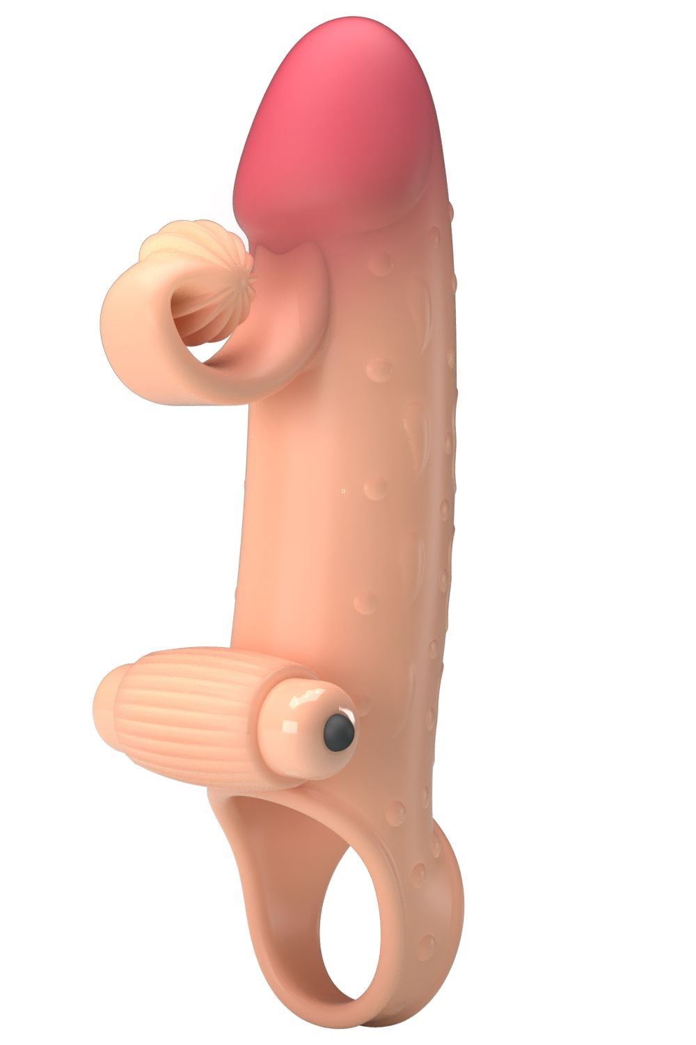 Телесная вибронасадка на пенис с подхватом мошонки. Насадка удлиняет член, добавляет ему толщины. Обеспечивает партнёрше массаж клитора при глубоких проникновениях.