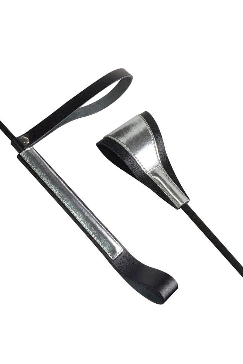 Основа стека - гибкий и прочный углепластик с черным нейлоновым плетёным покрытием. Гладкая и удобная цилиндрическая рукоять обтянута черной кожей с серебряной вставкой и имеет удобную черную кожаную петлю для фиксации изделия на запястье (темляк). Окончание-хлопушка выполнено в виде сложенной полоски из плотной натуральной высококачественной кожи черного цвета с серебряной контрастной отделкой.