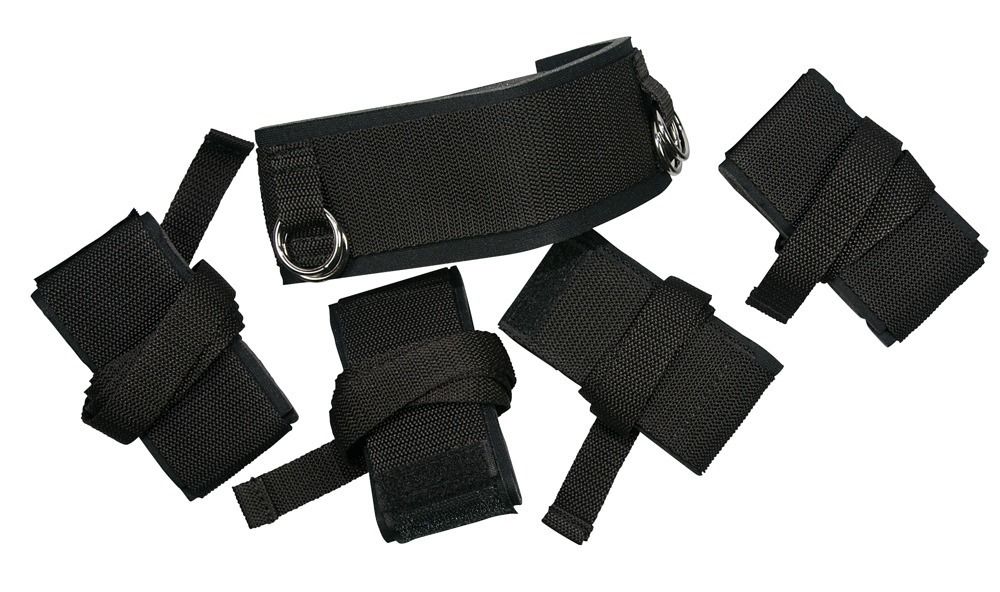 Набор для фиксации рук и ног к ошейнику Fesselset-System. Все элементы (ошейник, манжеты для рук и ног) снабжены лентой для соединения друг с другом. Длина лент - 132 см.
