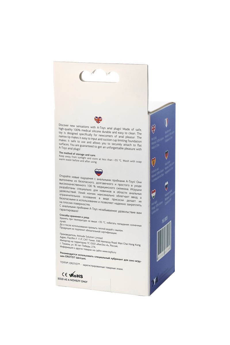 Откройте новые ощущения с анальными пробками A-Toys! Она выполнена из безопасного, долговечного и простого в уходе высококачественного 100% медицинского силикона. Игрушка разработана специально для новичков в области анальных удовольствий. Узкий кончик максимально облегчает ввод, а ограничительное основание в виде присоски делает ее безопасной в использовании и позволяет надежно закреплять на плоских поверхностях. Рабочая длина - 10 см.